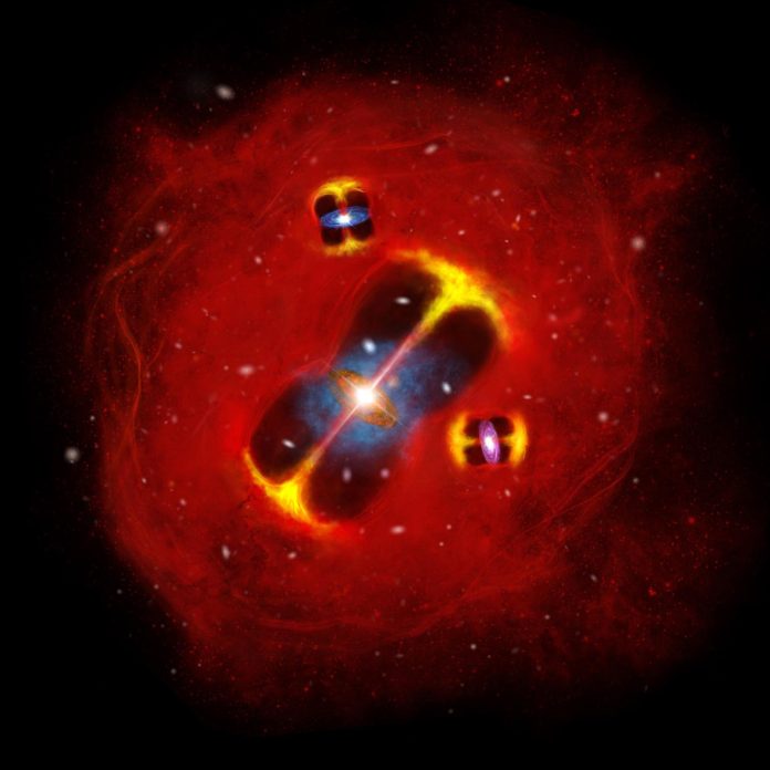 Dalam lingkungan yang begitu padat, interaksi antar-galaksi terjadi terus-menerus. Tabrakan antar-galaksi memicu pembentukan bintang besar-besaran, yang kemudian meledak sebagai supernova. Bersamaan dengan itu, materi yang jatuh ke lubang hitam di pusat galaksi memicu semburan jet energi tinggi (radio jets). Kombinasi dari “angin” galaksi ini menyuntikkan energi luar biasa besar ke gas di sekitarnya, memanaskannya hingga jutaan derajat dalam waktu singkat.